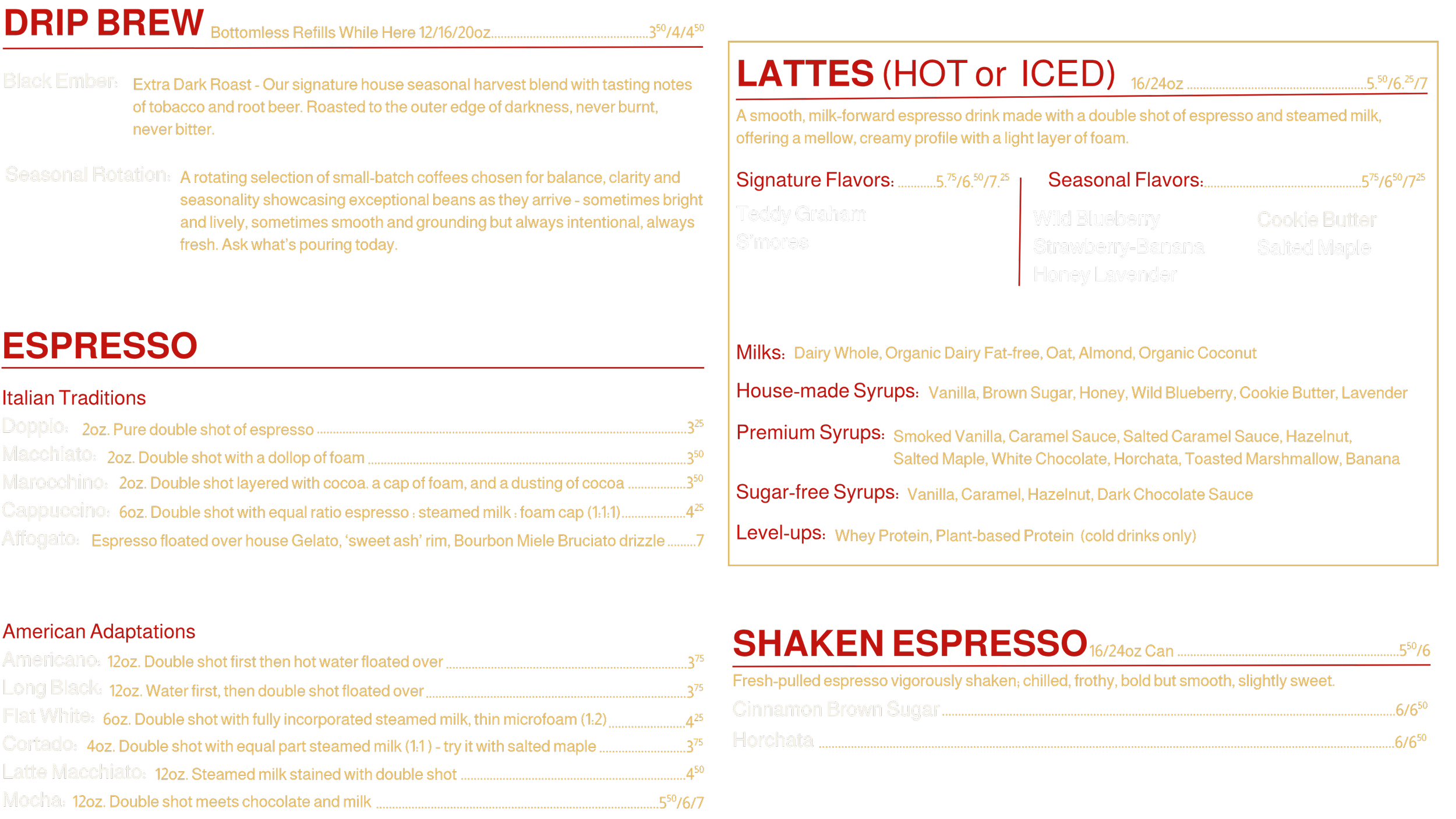 At EMBER, alcohol is never the point; its accent. Our Caffe Corretti menu draws from Italian coffee tradition, where a touch of spirit is used to deepen aroma, warmth, and ritual without overshadowing the coffee itself. Each drink begins with carefully prepared espresso or cold brew and is thoughtfully “corrected” to elevate the experience, not turn it into a bar moment. The result is coffee, refined; meant to be savored slowly, with intention.